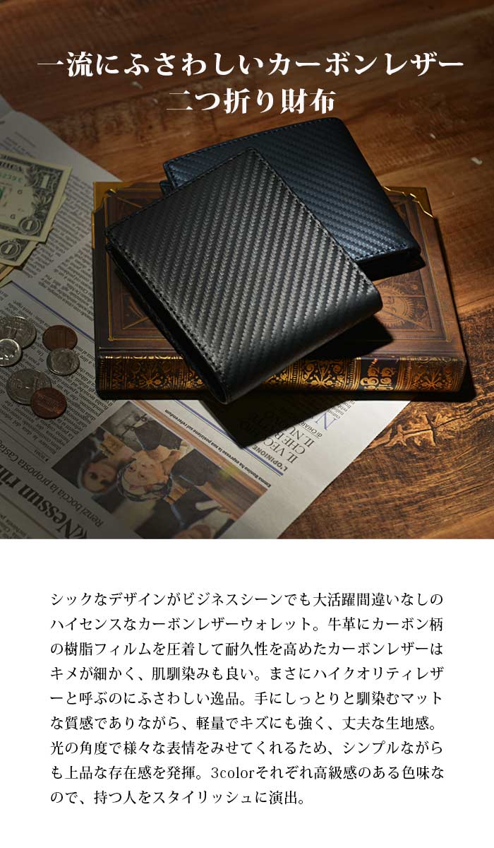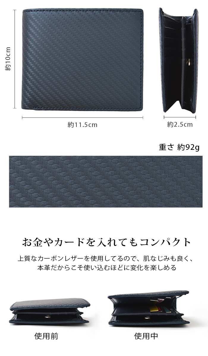 ギフト プレゼント/ギフト/贈り物/誕生日 バースデー/ホワイトデー/バレンタインデー/クリスマス xmas/ハロウィン/記念日 お祝い/出産祝い/結婚式/ウェディング/パーティー/卒業祝い/入学祝い/就職祝い/入社祝い/母の日/父の日/ご褒美/喜ぶ/1月 2月 3月 4月 5月 6月 7月 8月 9月 10月 11月 12月/春/夏/秋/冬/彼氏/旦那/夫/息子/弟/兄/父/祖父/男性用/紳士/男友達/彼女/嫁/妻/娘/妹/姉/母/祖母/女性用/婦人/女友達本革カーボンレザー二つ折り財布 カーボンレザーの美しさが光る使い勝手抜群の二つ折り財布シックなデザインがビジネスシーンでも大活躍間違いなしのハイセンスなカーボンレザーウォレット牛革にカーボン柄の樹脂フィルムを圧着して耐久性を高めたカーボンレザーはキメが細かく、肌馴染みも良い手にしっとりと馴染むマットな質感でありながら、軽量でキズにも強く、丈夫な生地感光の角度で様々な表情をみせてくれるため、シンプルなカラーながらも上品な存在感を発揮BOX型の小銭入れが使いやすさ抜群札入れの奥にもカードポケットがあり、計16ヶ所のカードポケットを装備 商品名 本革カーボンレザー二つ折り財布 カラー 10-ブラック(黒色)/21-ダークブラウン(こげ茶色)/50-ネイビー(紺色) ※出来るだけ実物のお色に近づける様に撮影しておりますが、室内照明での撮影の為、商品画像と実物のお色は多少違う場合が御座いますのでご了承下さいませ。