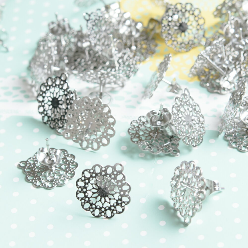 【サージカルステンレス 316L 】花柄模様 ピアス シルバー タイプB 通し穴つき 15mm 4個(2ペア) キャッチ付き ステンレス アクセサリー パーツ 金属アレルギー対策